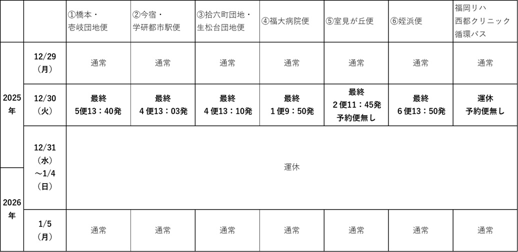 年末年始期間中、下記の日程にて無料送迎バスを運行いたしますが、運行日程や時間に変更がございますので、何卒ご確認のほどお願い申し上げます。